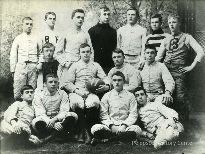 Black & white photograph of the Brunswick High School Football Team in 1891. The football held by a player in the center of the photo has "91" written on it. Dated 1891.