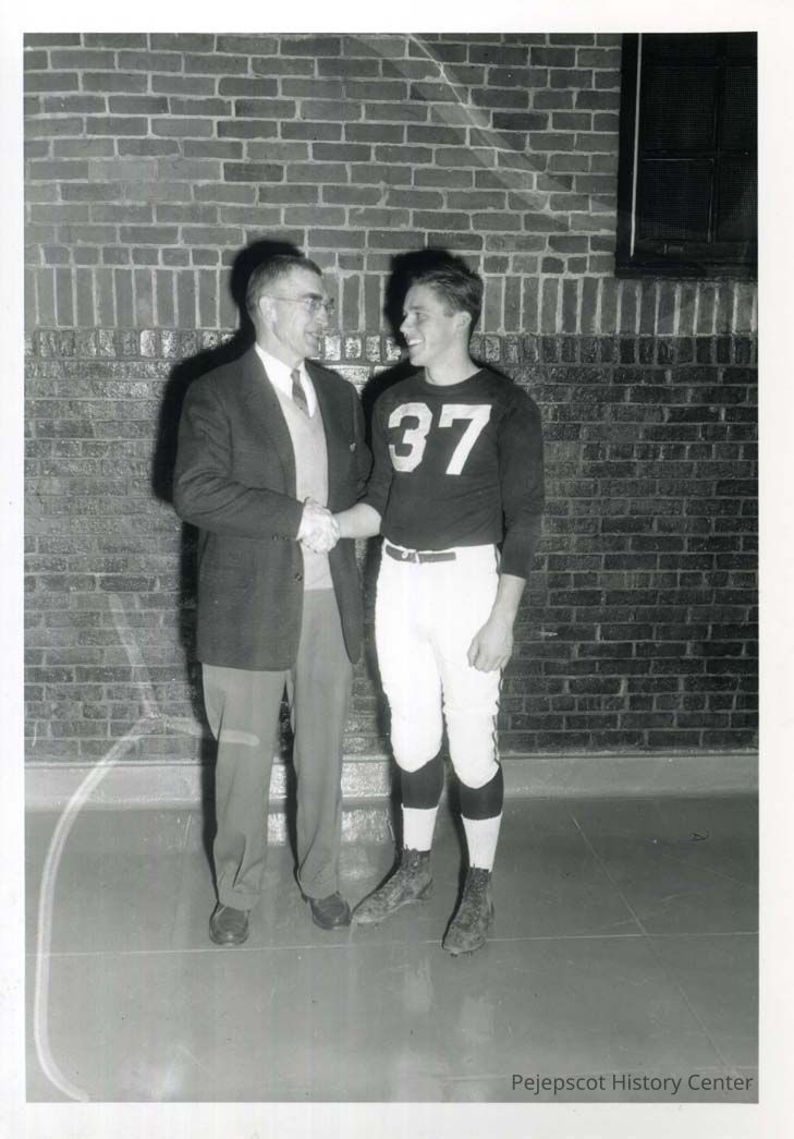 BHS football player number 37 shakes hands with a teacher outside the school building.