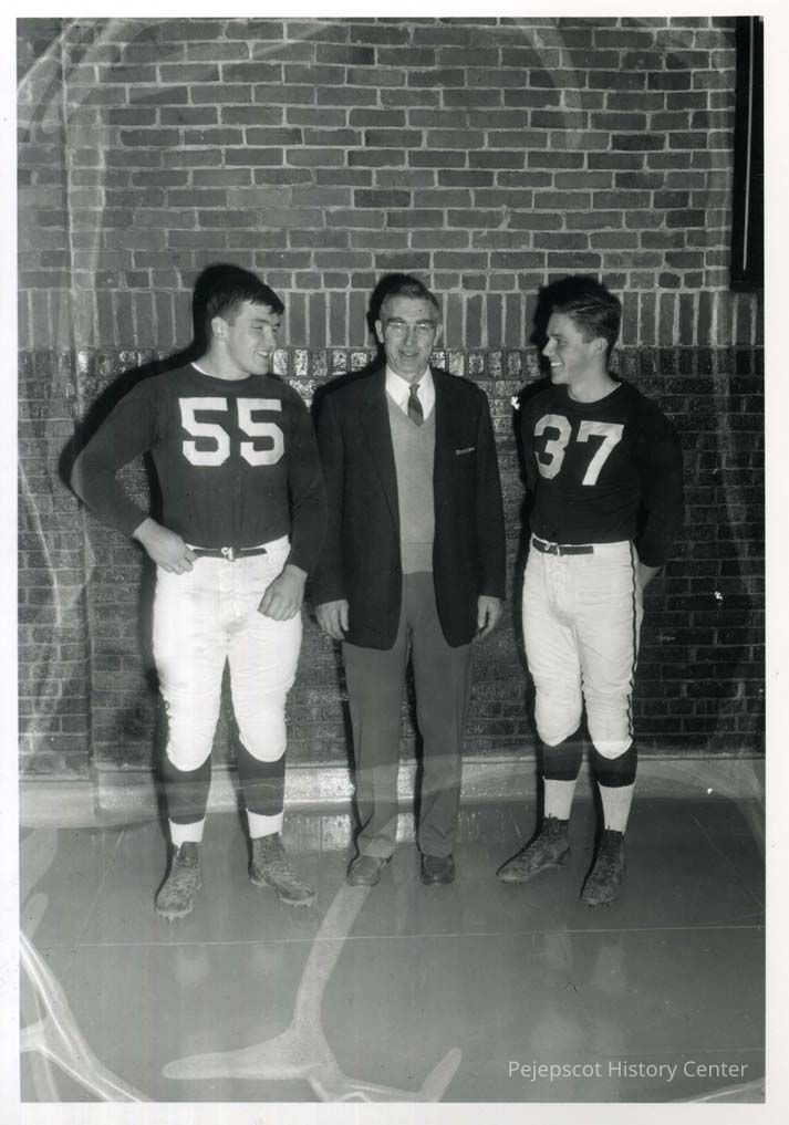Two BHS football players, numbers 37 and 55, stand with a teacher outside the school building in 1956.