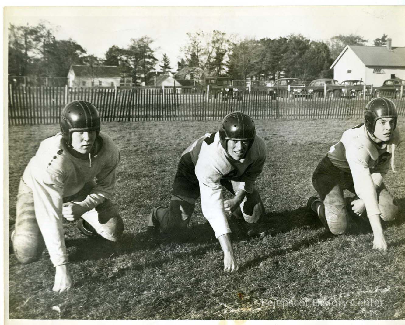Three football players lined up in a crouching position at Brunswick High School football practice at Edward's Field. The three players are Gilbert Ormsby, Ernie Plass or Jim Herrick, and David Dube. Undated