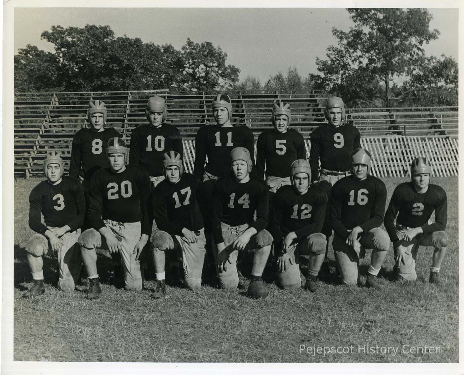 The 1947 Brunswick High School football team. The jersey numbers are used to identified team members; 2) Frank Lavigueur, 3) James Bleau, 5) Norman Roy, 8) Roger Levesque, 9) Robert Lord, 10) John Morrell, 11) Bill Dube, 12) John Engerski, 14) Roger Coffin. Players with the numbers 16, 17, and 20 are unidentified on the picture and not mentioned in the yearbook. UndatedLexicon