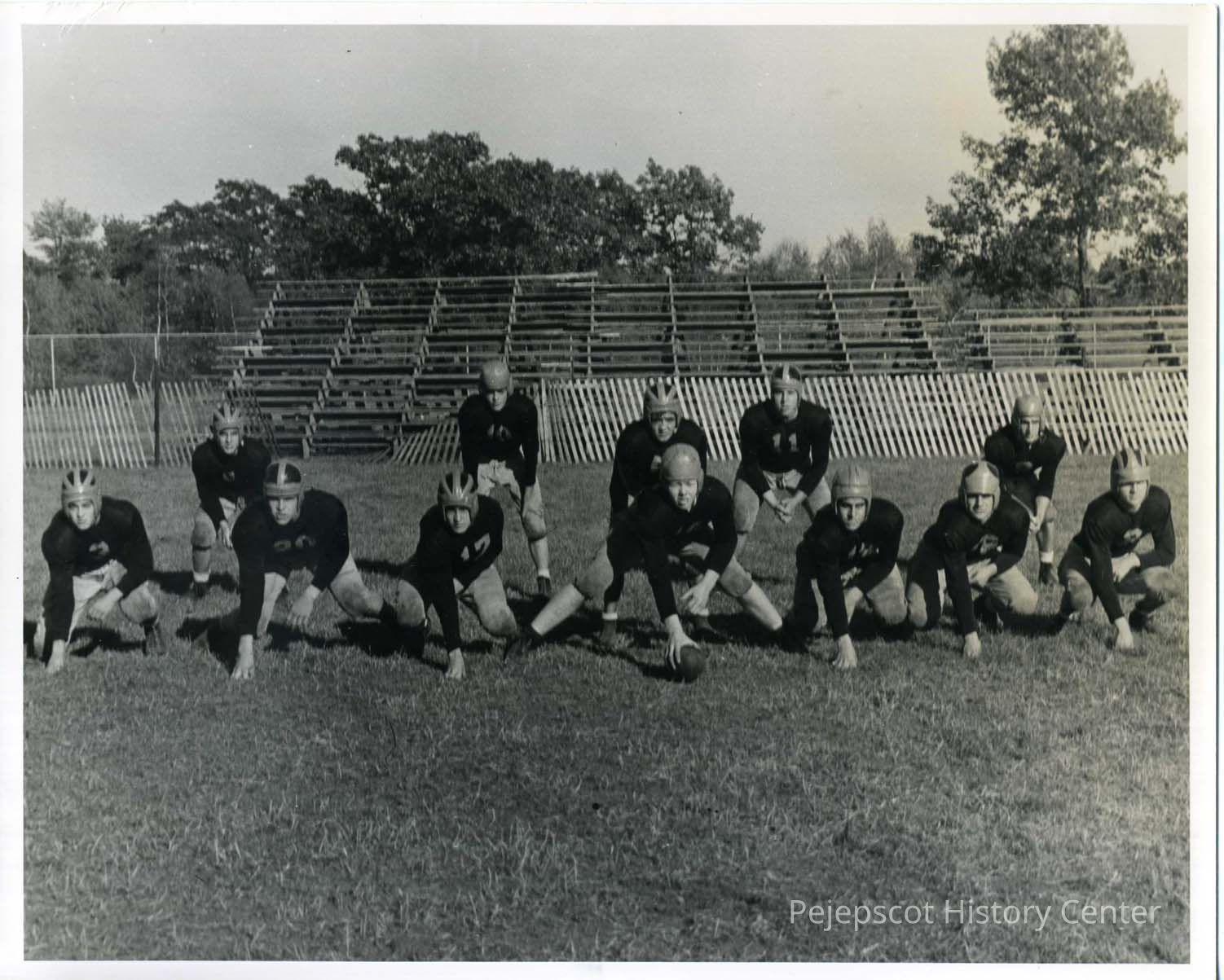 The BHS football team. Left to right the players are 1.)?, 2.) John Littlefield, 3.) Norm D'Orsey, 4.) Donald Coffin, 5.) John Engerski, 6.) Jim Herrick, 7.) Frank ?. The back row contains 1.)?, 2.)?, 3.) Norman Ray, 4.) Bill Dube, 5.) Reggie Lord. UndatedLexicon