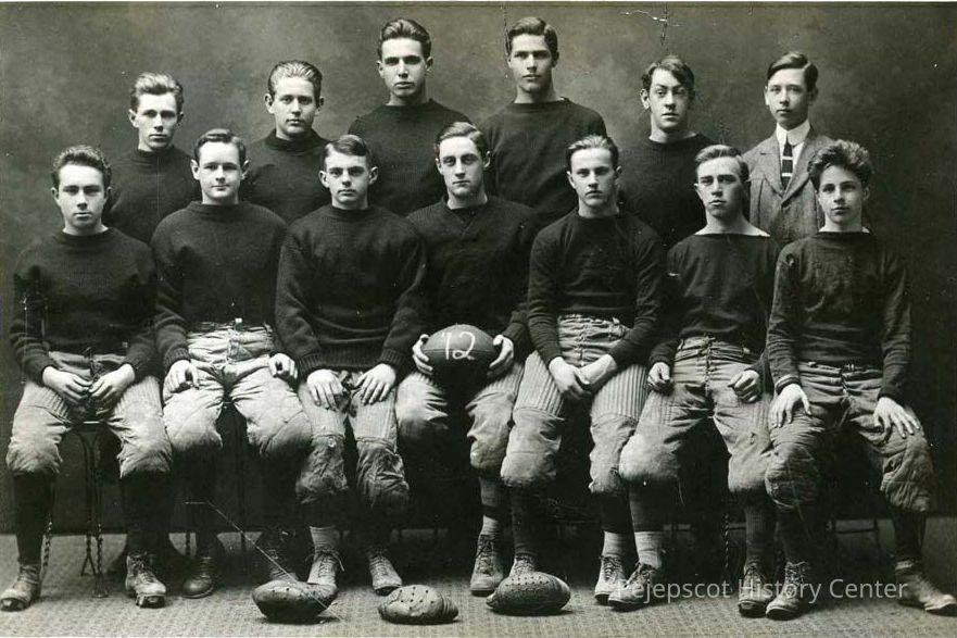 Black & white photograph of the Brunswick High School Football Team in 1912. The first boy on the left in front row is Frank M. Coombs. Dated 1912.