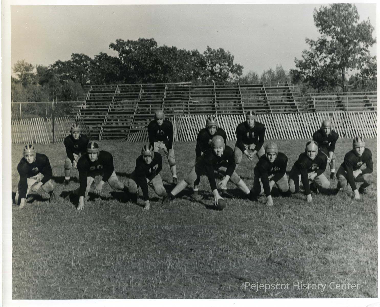 BHS football team of 1946 at Edwards Field with bleachers in the background. The 12 players are lined up and ready to go. Right end -- Artie Bleau, right tackle - John Littlefield, right guard ? Lord, center, Whitey Coffin, left guard - John Engerski, left end - Frank Laviguer. Backs (left to right) Norm De Orsey, John Merrill, Norm Roy, Bill Dube, Reggie Lord. UndatedLexicon