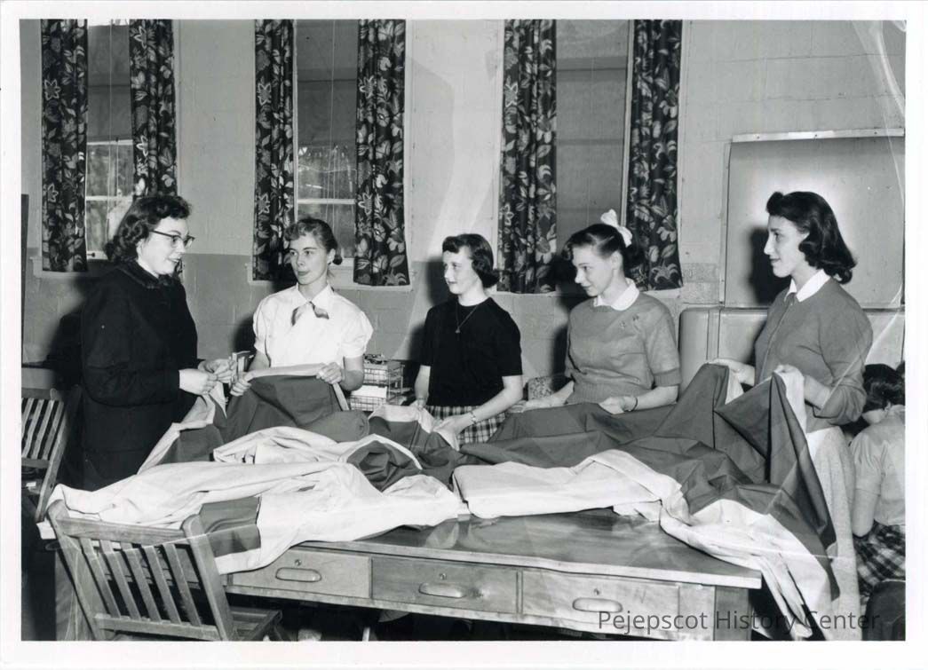 In a Home Economics class at BHS, four girls assist their teacher in making curtains for Coffin School. Left to right the people are: Miss Beverly Andrews, teacher; Janice Humphrey, Bowdoinham; Linda Randall, Topsham; Helen Porter, Bowdoinham; Gloria Bourque, Topsham.Lexicon
