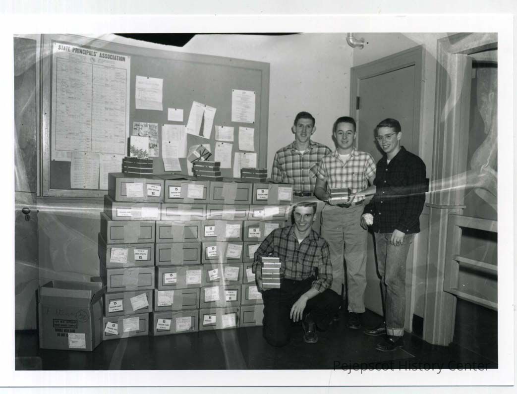 Four members of the Key Club at BHS who raised $400 for the Brunswick Area Student Aid Fund by selling Christmas cards. Pictured are Barry Walden who is kneeling. Standing are Pres. Frederick Fortin, Corliss Crowley, and David Berry. 12/01/56