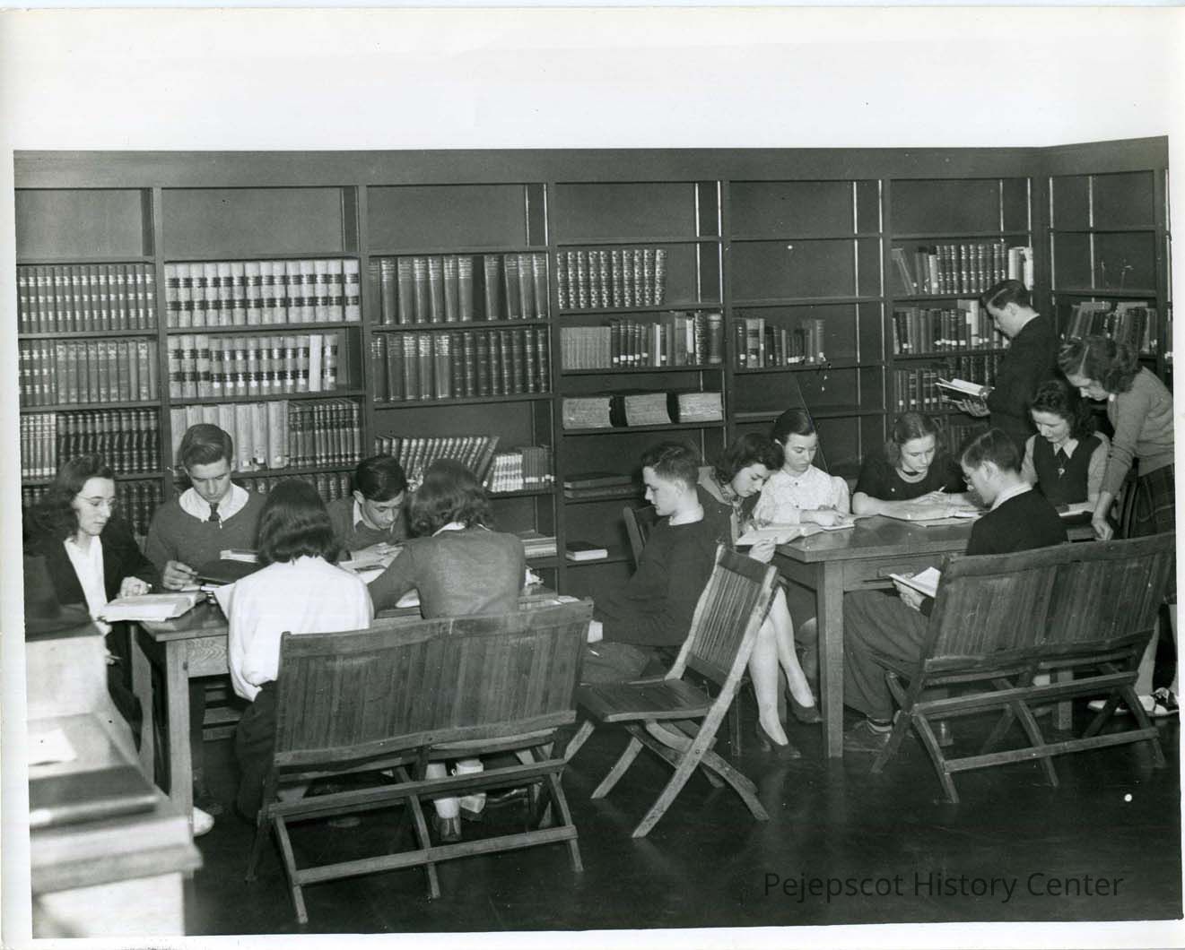 Thirteen students in the library at BHS. The five boys and 8 girls seated at the tables studying are members of the class of 1942. Undated