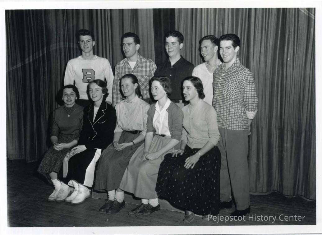 Five girls pose seated with five boys standing behind them. This is the BHS cast for a one act play contest on March 11, 1955.