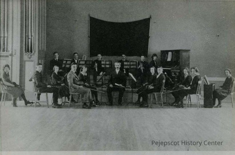Black & white photograph of the Brunswick High School Orchestra on stage in 1924, including 16 members & teacher Charles Warren. Duplicate of 1981.39.6a, but slightly smaller. Dated ca. 1924.
