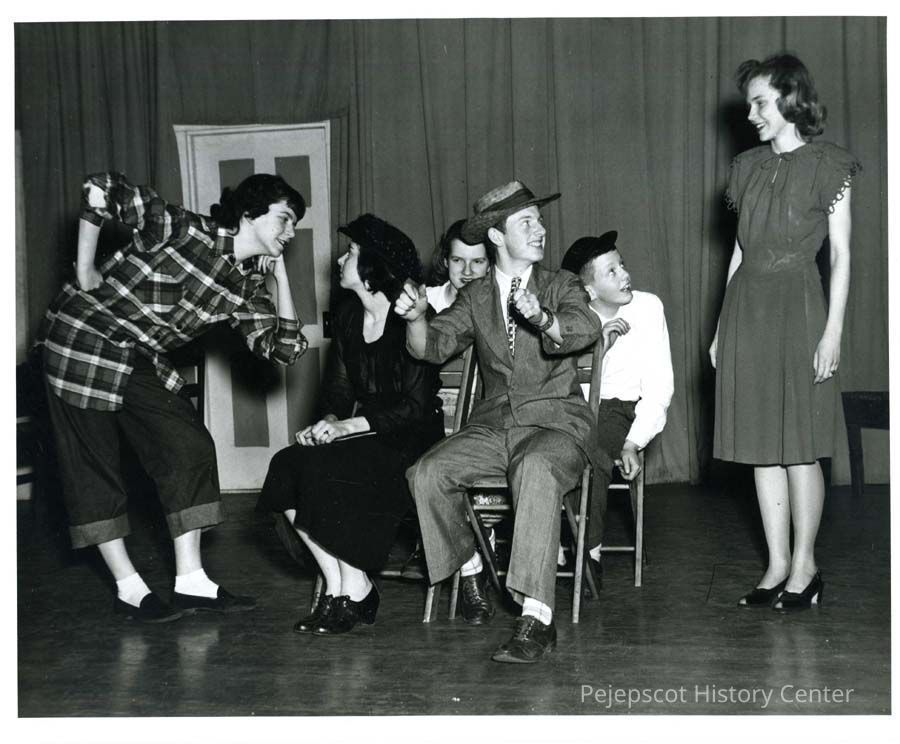 Black and white photographic of Brunswick High School play "Happy Journey from Camden to Trenton". Girl on left in plaid jacket - Beverly Bouchard; in back with white blouse - Dorothy Coombs; last girl - Evelyn Gamache. Others in photo Helen Knight; Richard Bartlett; Houston Clark; Anne Melhorn. See Orange and Black 1947. Undated