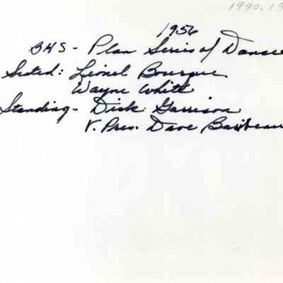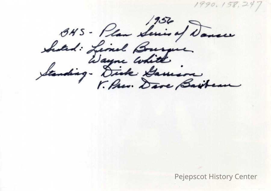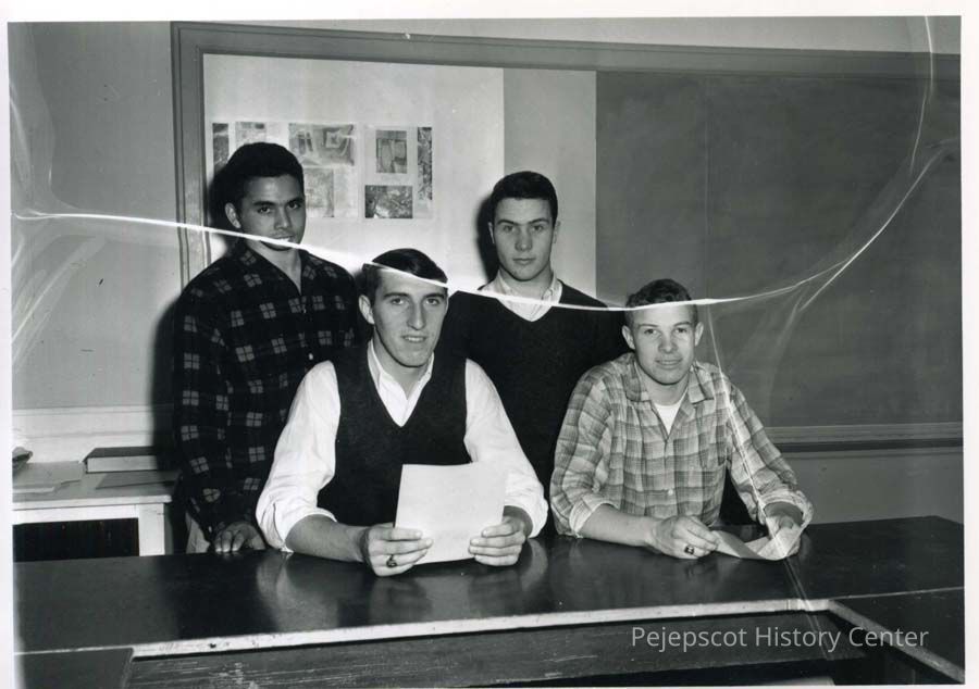 Black and white photograph of Brunswick High School Seniors planning a series of dances. Front row: Lionel Bourque and Wayne White. Standing: Dick Garrison and Dave Baribeau