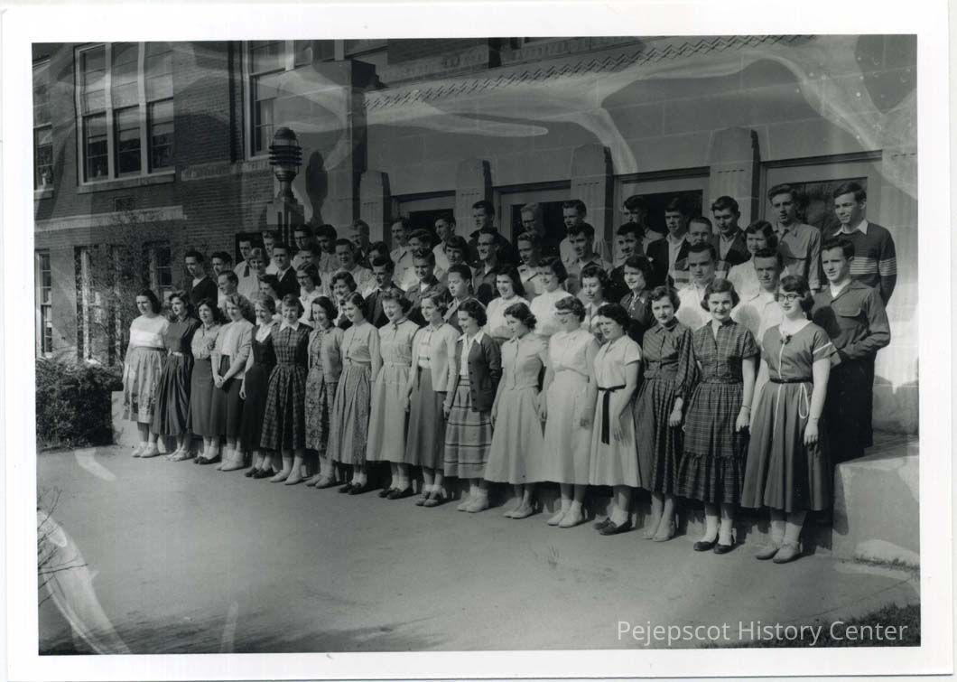 A large group of BHS students pose on the front steps of the school in 1956.