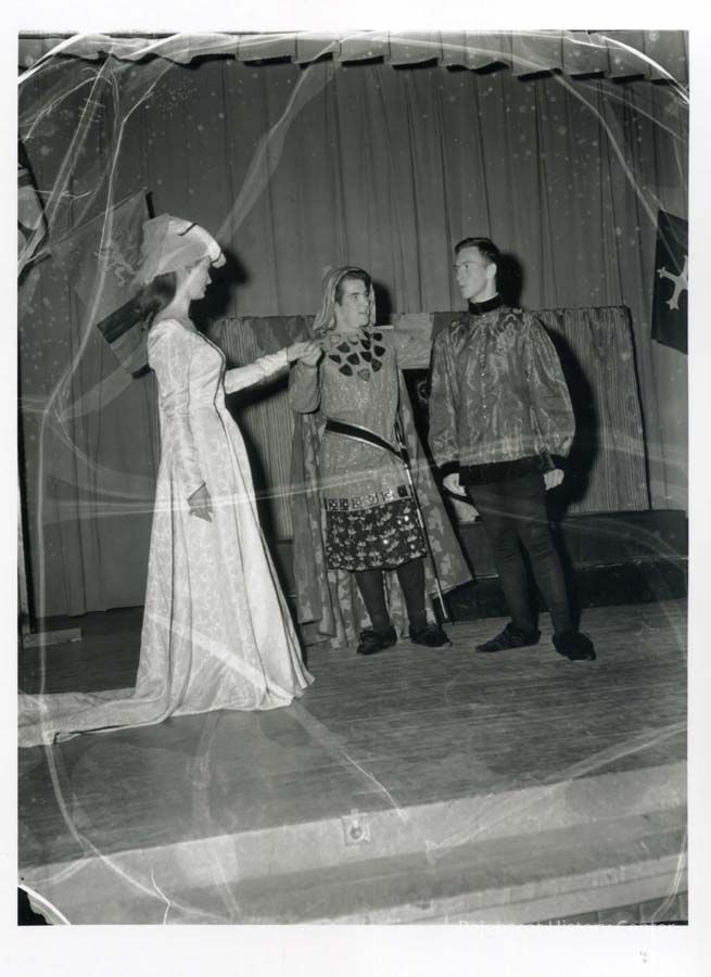 B/W photo of 3 principal actors in a BHS one act play, "Paola and Franseca." In costume are Sonnheilt Koelln as Franseca; Clement Rowe as Giovanni ; and David Lowell as Paola.