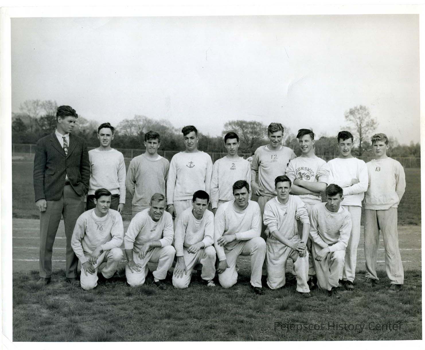 Brunswick High School track team of 1948. Stan Johnson, Coach. Front row; Prescott Cowley, C. Tillotson, Arnold Johnson (Capt.), Gilbert Ormsby, R. Given, K. Gordon. Back Row; S. Pomeroy, J. Locke, George Benoit, M. Lacharite, J. Trott, B. Leeman, B. Benoit, Mr. Karmer. UndatedLexicon