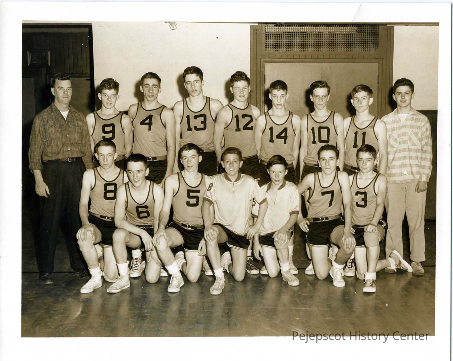 The Brunswick High track team of 1958 or 1959; #4 Ron Lamarre, #6 Steve Toothaker, #7 ? Theberge, #9 Art Warren, #11 ? Pearl, #13 ? Bouchard. Sylvester on the extreme right in the plaid shirt. UndatedLexicon