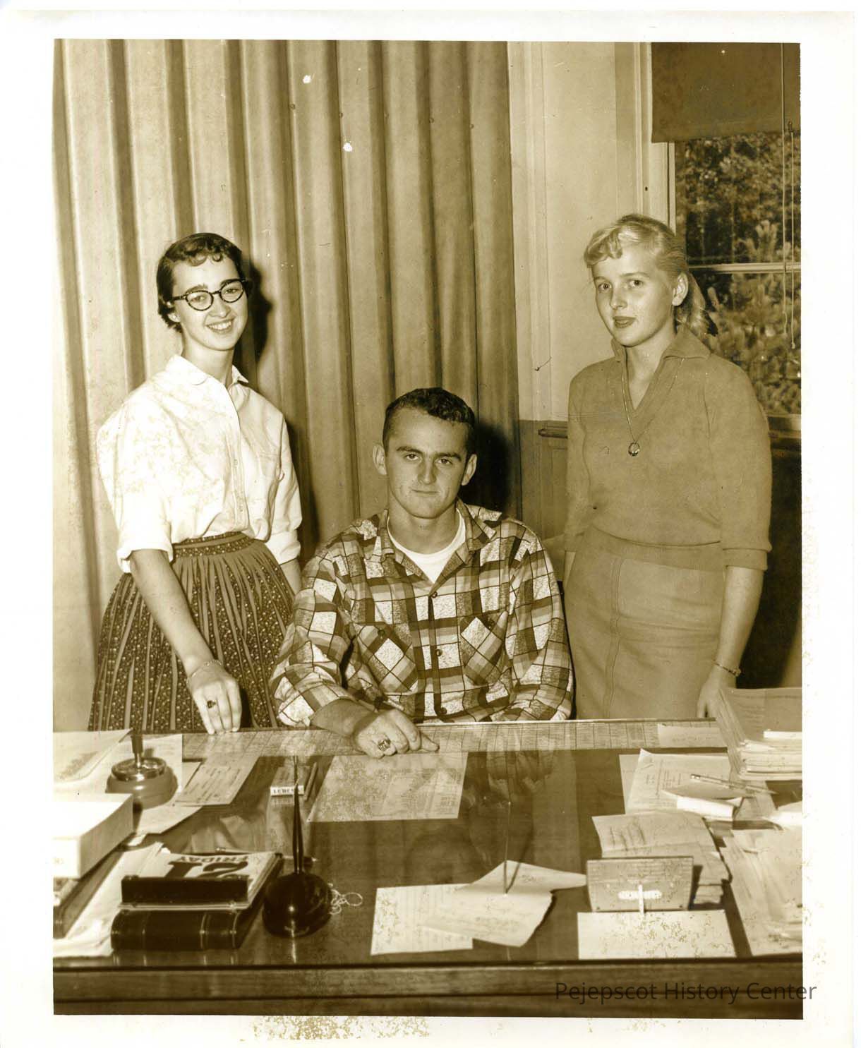 Yearbook staff 1957. Suzanne Tougas, Dick Snow, Barbara Crouse. Undated