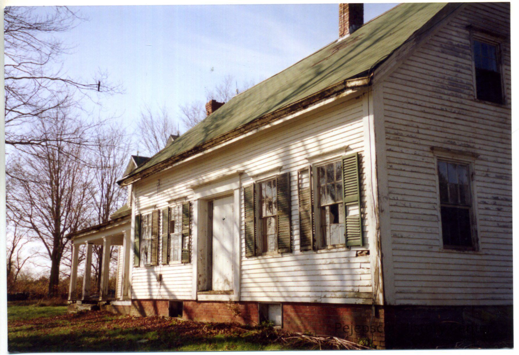 Photo shows the front of the main portion of the Bibber home on Route 123 in Harpswell Center. The house is empty, paint is peeling, and some window panes and shutter slats are missing. An attached smaller cape, ell, and barn are at the left. Only the porch columns of the attached house are visible.Collection