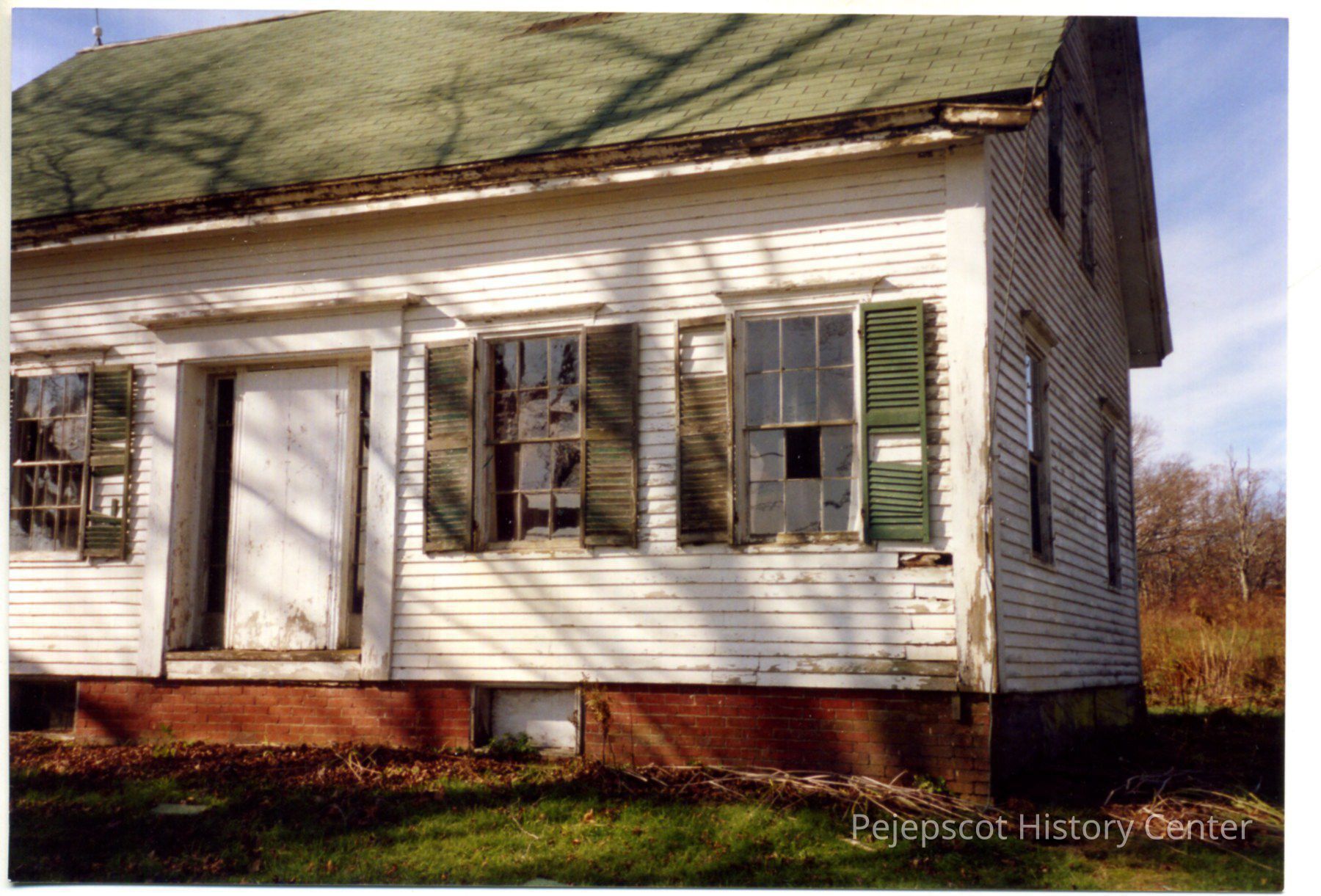Color photograph of home of Raymond and Francis Bibber, Rte. 123, Harpswell Center, ME. Cape-style home showing part of one front window, door, two more front windows; gable end. Paint peeling, some panes of glass and shutter slats missing. Brick foundation, clapboard siding.