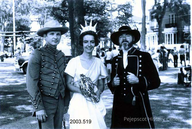 A black and white photo of three unidentified people -- a man in confederate attire, a woman as Lady Liberty and a man in a Union uniform posed on the Mall in Brunswick, Maine, on 7/4/1976 as part of the town's celebration of the U.S. Bicentennial. The photo is similar to 2003.518.