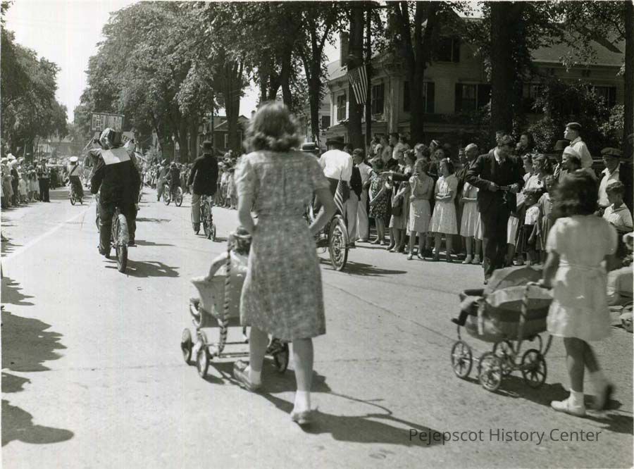 A B/W photograph of the Bicentennial Parade, Brunswick, Maine. This is showing baby carriages being pushed down the street. 7/4/1939.
