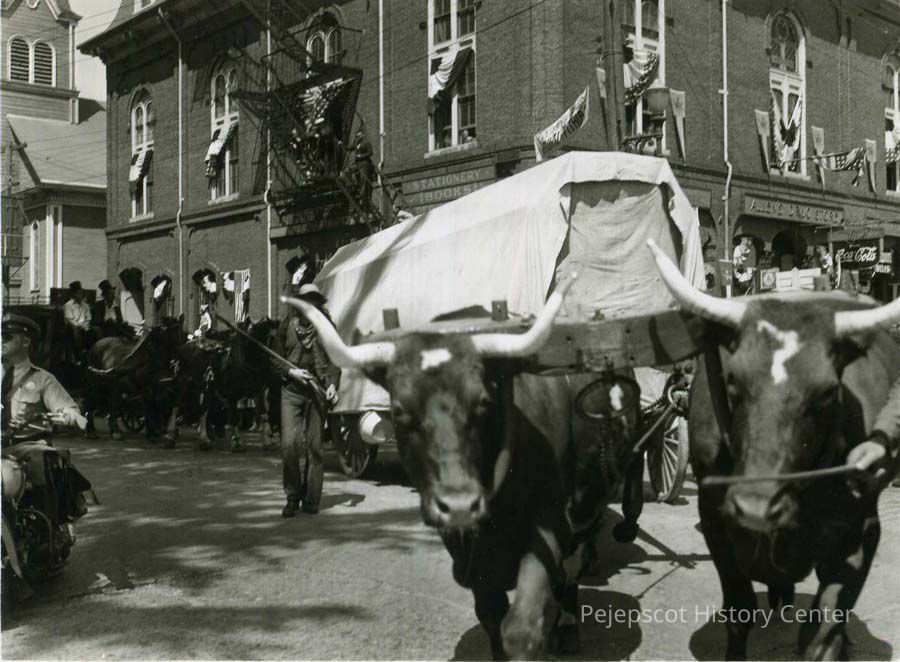 A B/W photograph of the Bicentennial Parade. It shows a wagon at the intersection of Maine and Pleasant Street, Brunswick, Maine. 7/4/1939