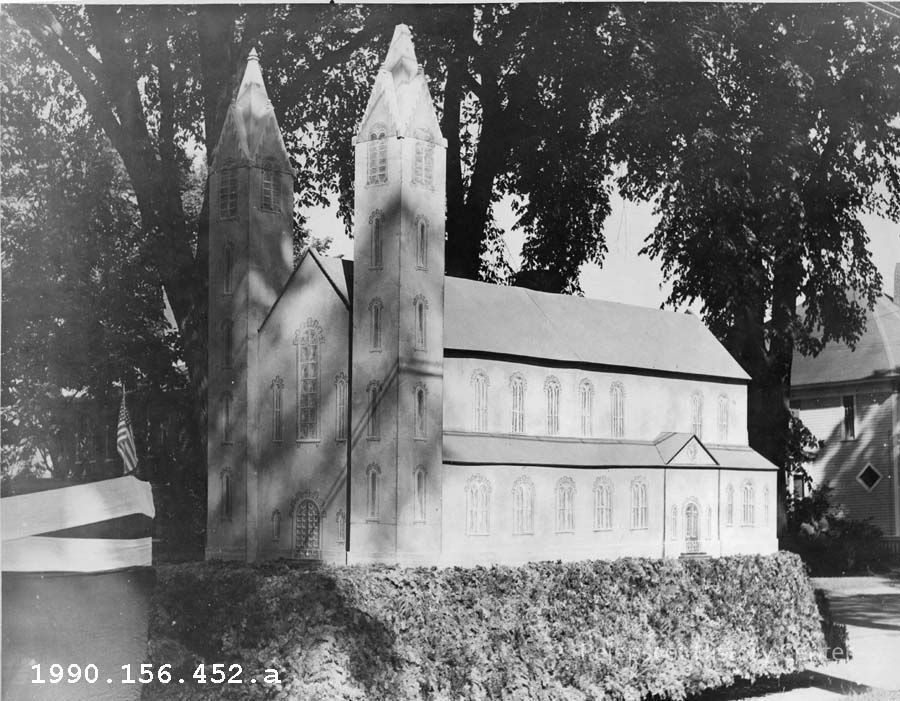 A B/W photograph of the 200th Anniversary Parade. It shows a float that appears to be the Bowdoin College Chapel. 1939