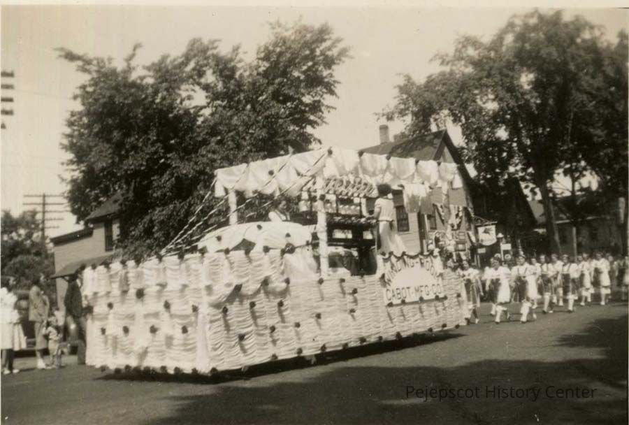 A B/W photograph of the Bicentennial Parade, Brunswick, Maine. This is the Cabot Mill float. 7/4/1939.