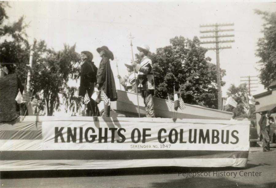 A B/W photograph of a Bicentennial Parade Knights of Columbus float. Brunswick, Maine. 7/4/1939.