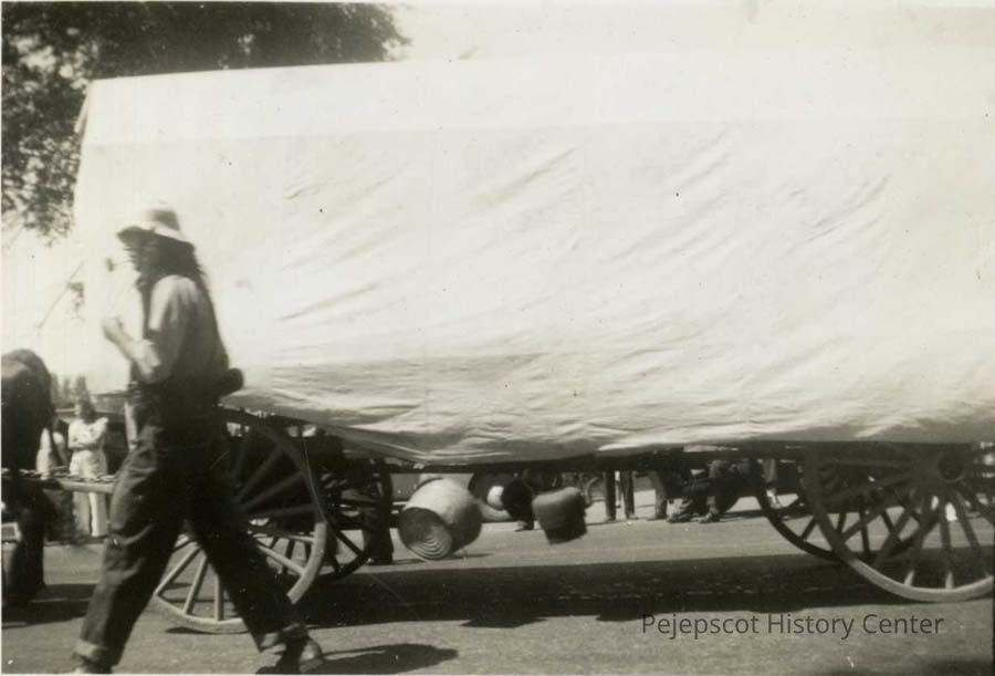 A B/W photograph of the Bicentennial Parade showing a float with a man walking beside it. Brunswick, Maine. 7/4/1939.