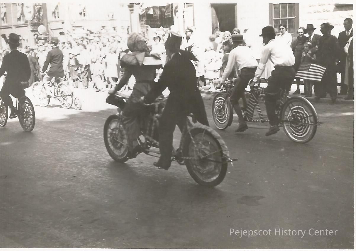 A B/W photo of a "bicycle built for two" group in Brunswick's 200th Anniversary parade. Undated