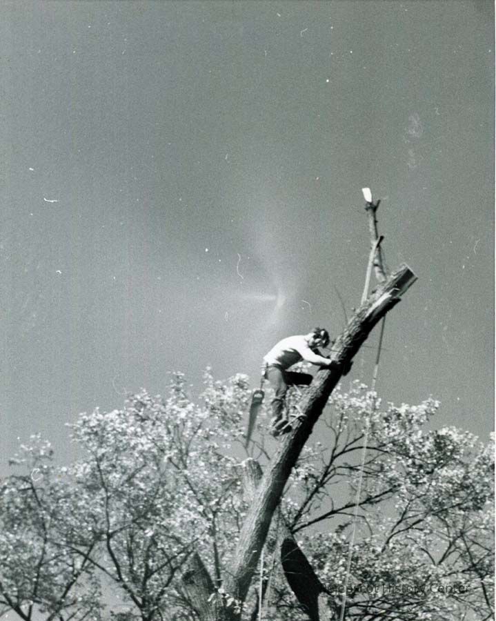 B/W photo of Bill Lawrence cutting off branches of the elm trees on Mason Street. No date.
