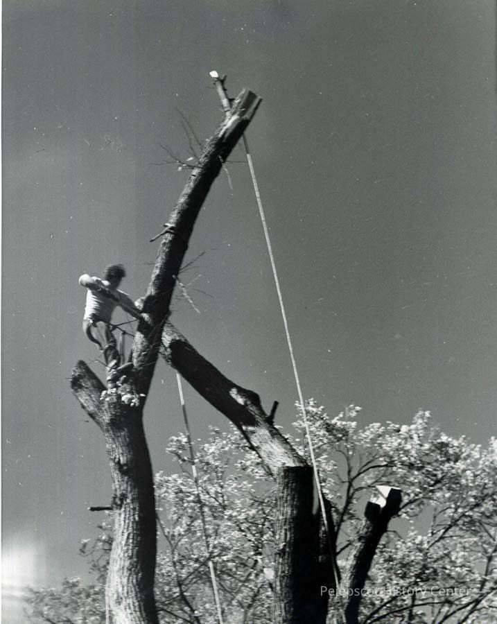 B/W photo of Bill Lawrence cutting the highest branches of elm trees with a hand saw. No date.