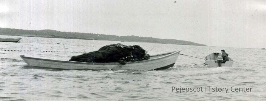 B/W photo of Billy Saxton bringing a dory holding a seine ashore off South Harpswell, ME. No date.