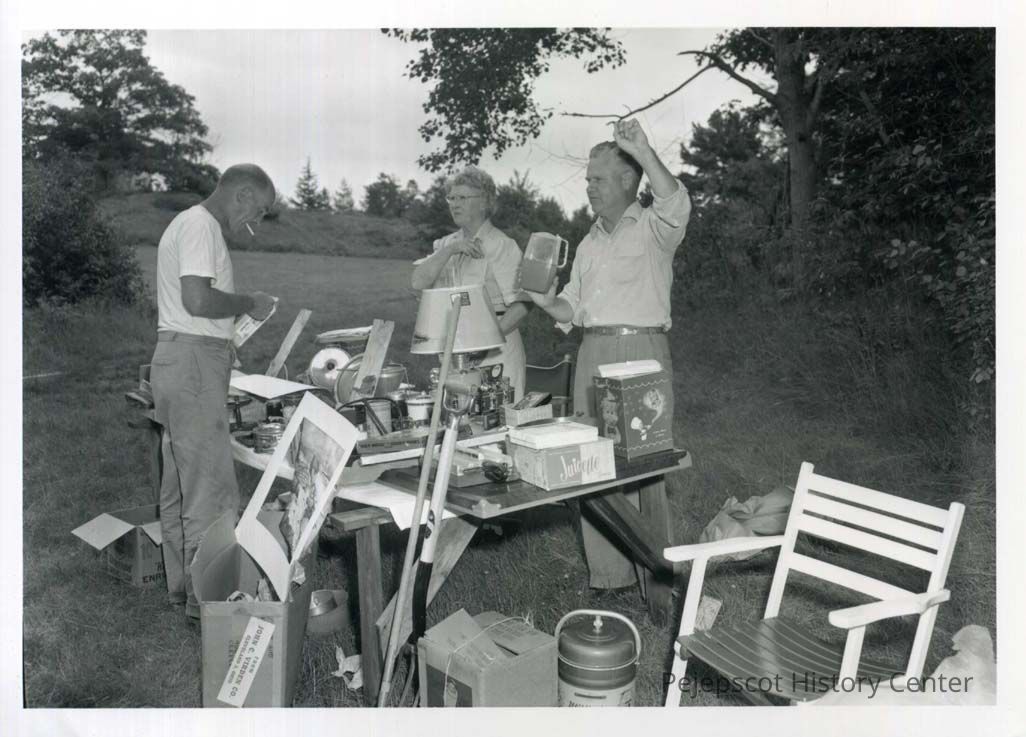 Three people prepare items for sale at the Birch Island Auction on July 28, 1951. The workers are: Malcolme Clarke, Bronxville, New York; Mrs. Marion Strobel, Brookline, Mass.; Brice H. Booker, Brunswick.Lexicon
