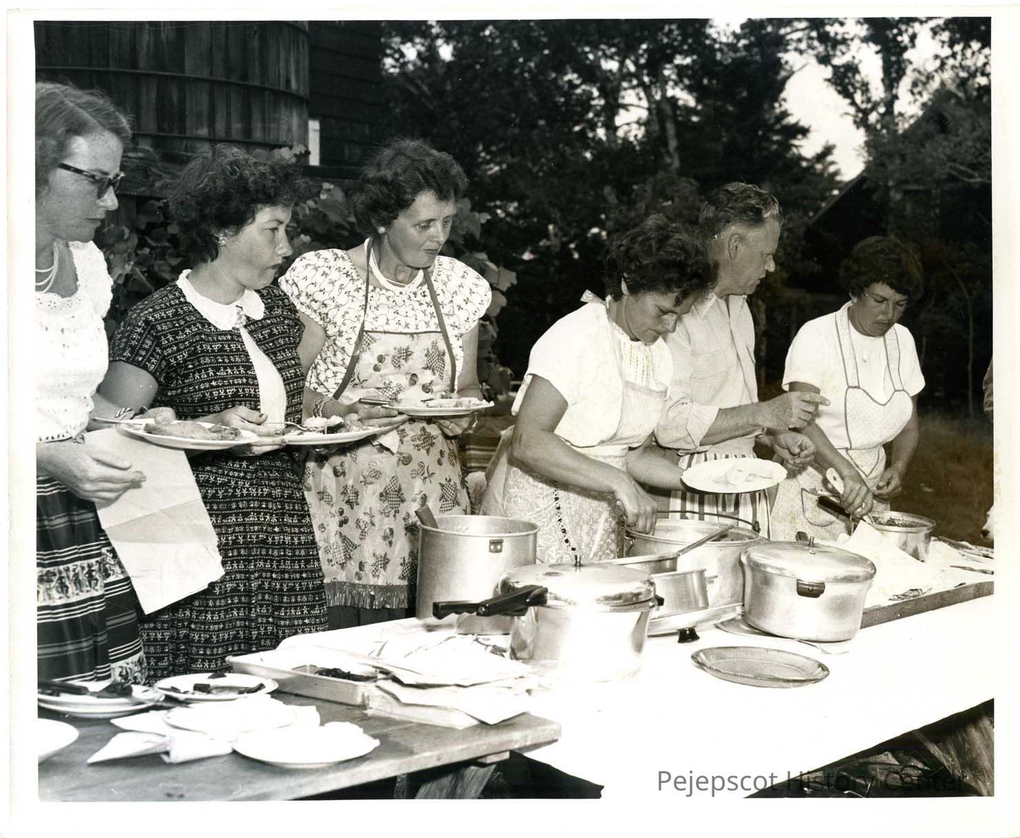 Birch Island Field Day dinner in 1955. The people standing behind the buffet table left to right are; Helen Wally, Addie Mae Missy, Dottie Baker, Mildred Snow, Brice Booker, and Pearl Booker. UndatedLexicon