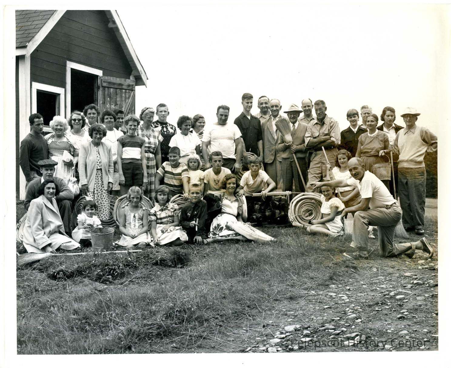 Birch Island fire drill taken at the fire house. Standing in back from left to right; James Burke, Willa Downes, Albertine Reynoldi, Helen Walley, Dotti Babson, Pearl Booker, Ellen Booker, Elizabeth M. Geer, Doc Clark, Mildred Snow, Nancy Snow, James F. Snow Jr., Richard Geer, James Downey, William Walley, Louis Cadieny, Gene Babson, Charles Johnson, Judy Clark, Brice Booker, Fran Clark, Barbara Geer, Walter Downey. Middle row; Terry Downes, Martha Snow, ?, ?, Carol McCrann. Front row; Biggah Burke, Ellen Burke, Dedie Schmidt, Barbara Thissell(?), Richard Thissell(?), Willa Schmidt, Frank Schmidt, ?, Frank Clark (Fire Chief). UndatedLexicon