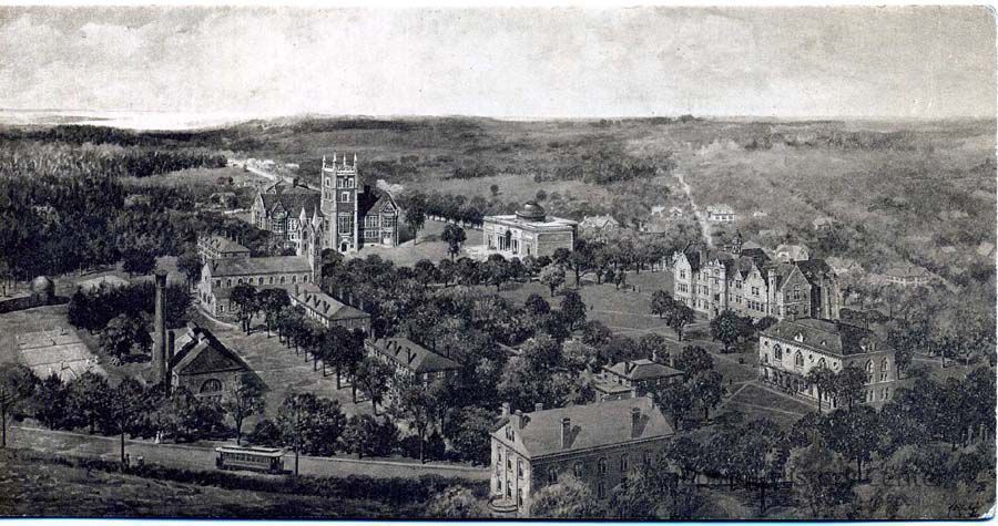 B/W postcard with a bird's eye view of the Bowdoin College campus. 1907
