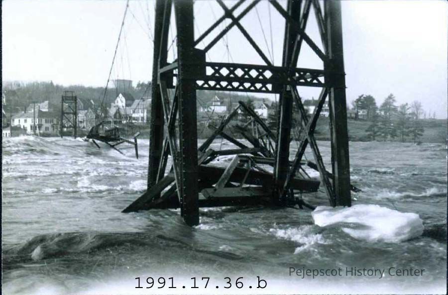 A black and white photograph of the Black Bridge on Mill Street during the 1936 flood.