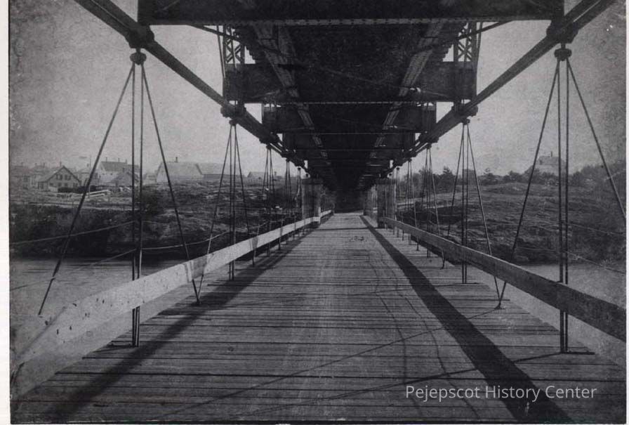An undated photograph of the "Black" bridge over the Androscoggin River between Topsham and Brunswick. The top level is a railroad bridge and the lower level for automobiles.