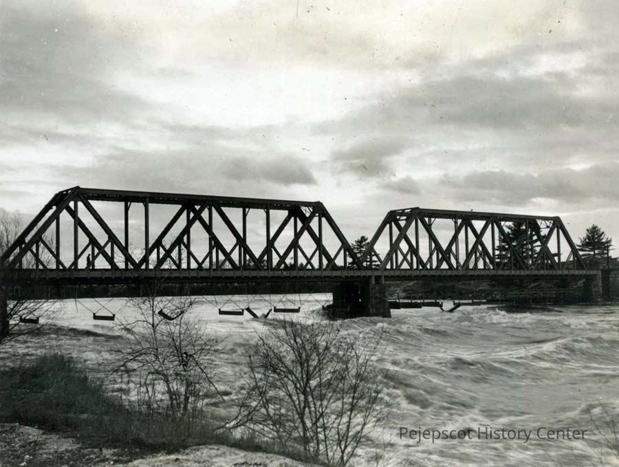 A B/W photograph of the Black Bridge during the 1936 flood. The automobile portion of the bridge is almost completely destroyed.
