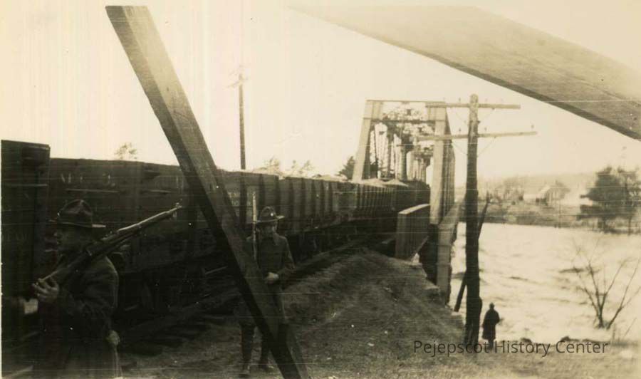 A B/W photograph of the Black Bridge during the 1936 flood. There are freight cars parked on the bridge and National Guard troops guarding it. Undated