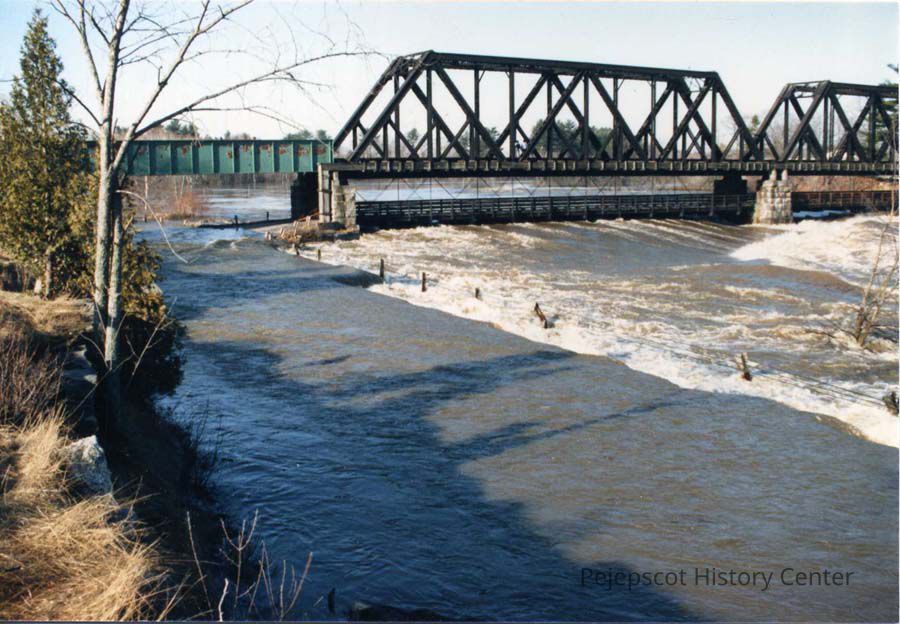A color photo of the Black Bridge and Mill Street in Brunswick, Maine taken during the April 1987 flood.