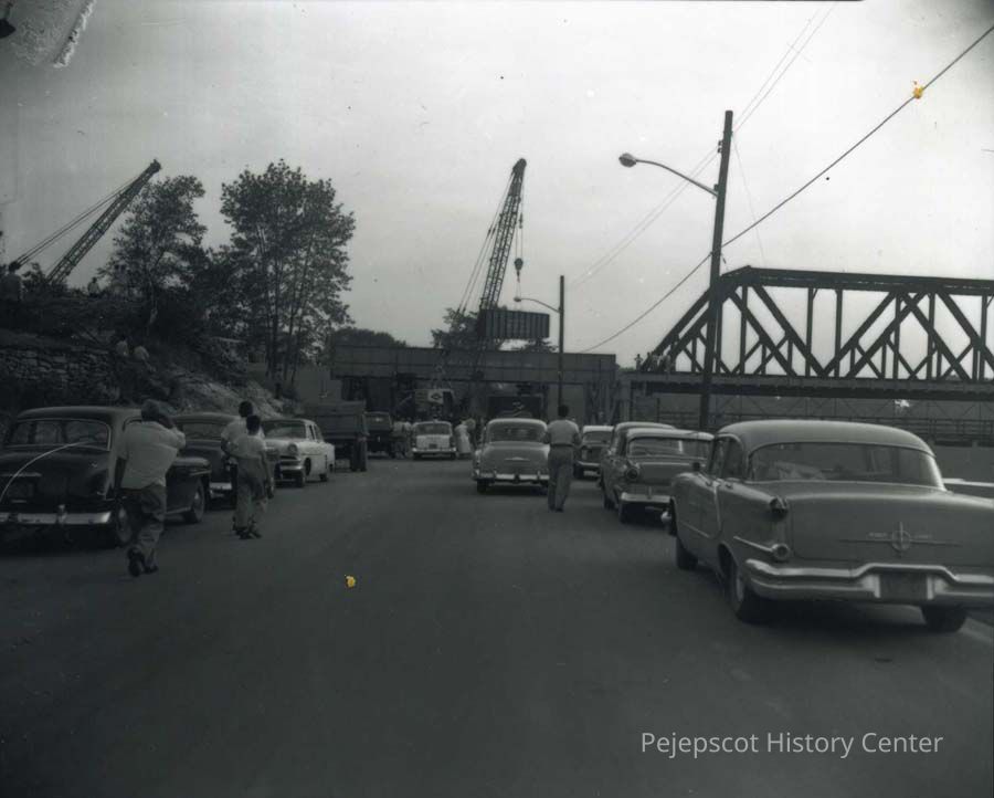 A B/W photograph of the Black Bridge on Mill Street being repaired.