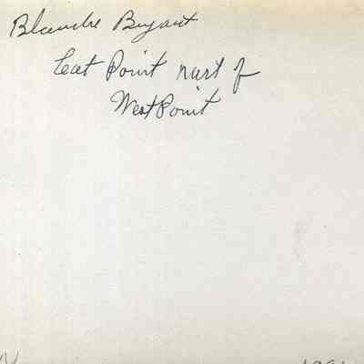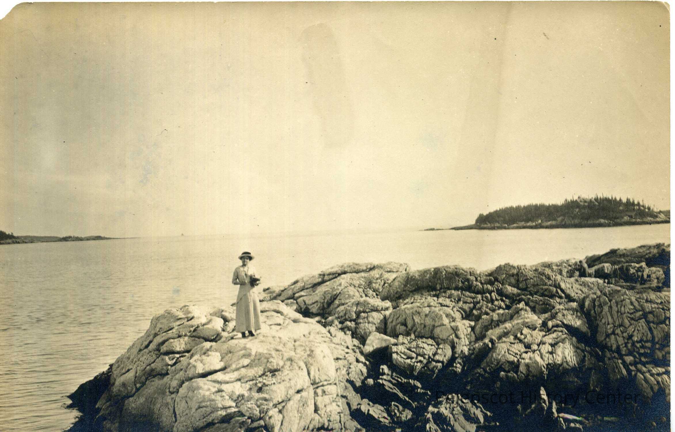 An undated black and white photograph of Blanche Bryant on the rocks at Cat Point, part of West Point.
