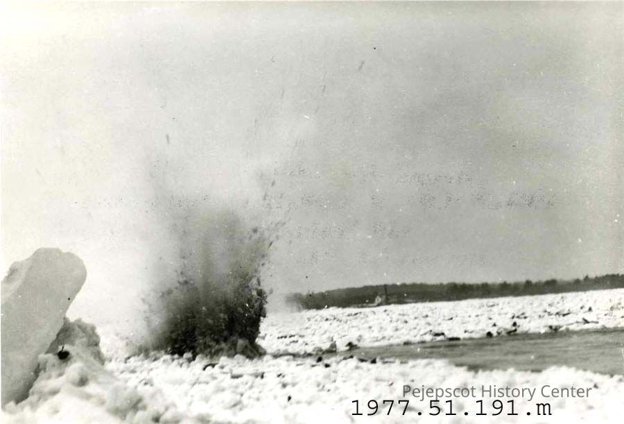 Blasting an ice jam during the 1936 flood in the Androscoggin River.Entry/Object ID