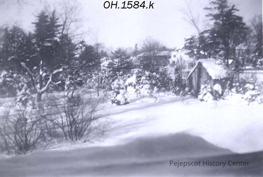 A B/W photograph of the Blizzard of 1952. Snowstorm - February 17 and 18, 1952, showing a snow covered field and utility shed.