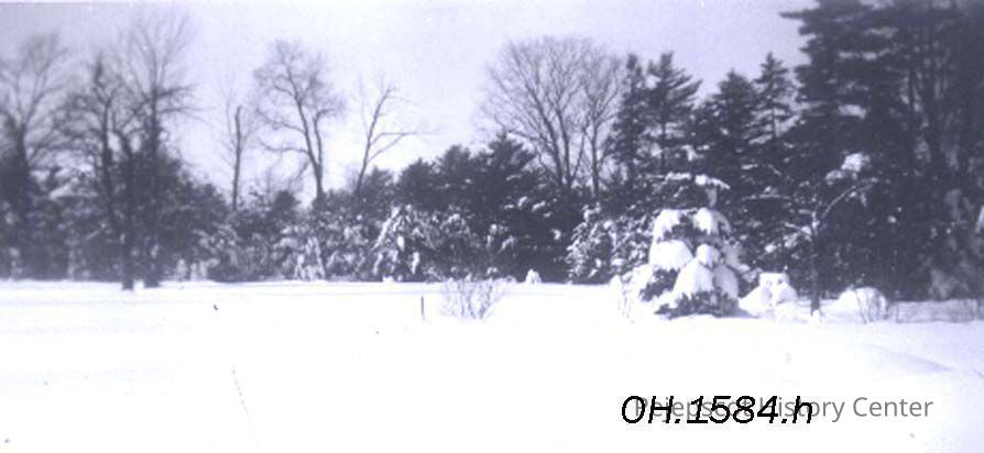 A B/W photograph of the Blizzard of 1952. Snowstorm - February 17 and 18, 1952, showing a field with snow covered trees.
