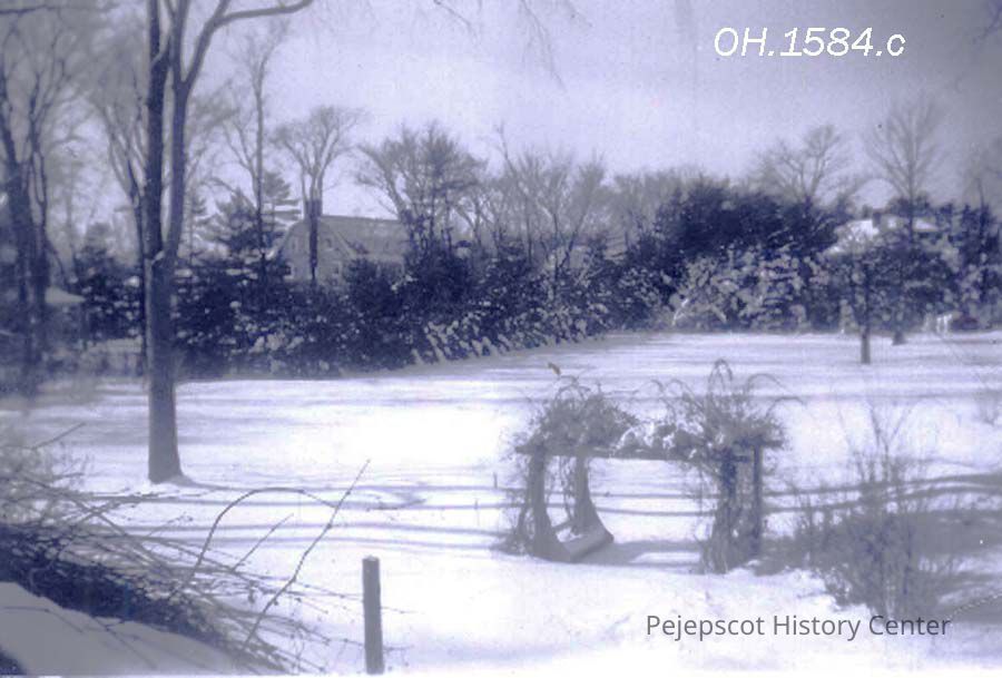 A B/W photograph of the blizzard of 1952. Snowstorm February 17 & 18, 1952 showing an unnamed field with half of an arbor showing.