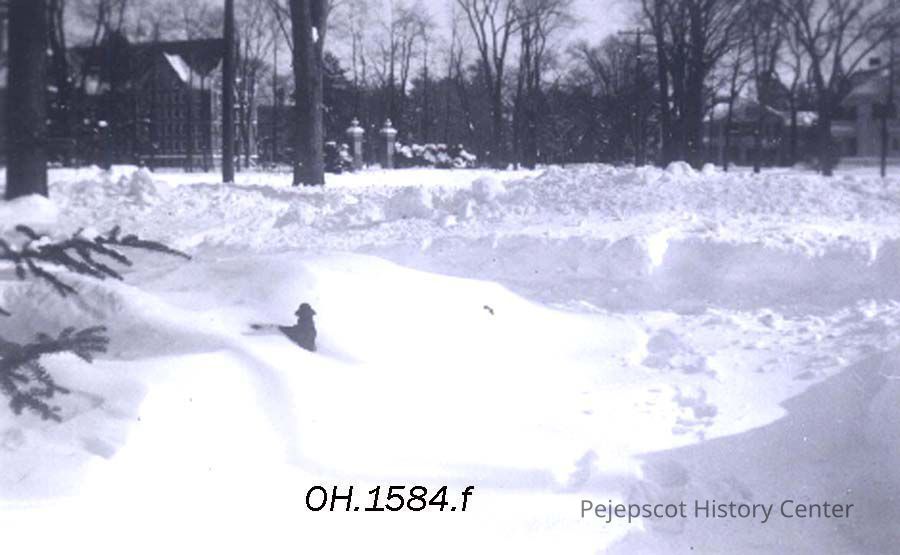 A B/W photograph of the Blizzard of 1952. Snowstorm - February 17 and 18, 1952, showing a portion of Bowdoin College, Brunswick, ME buried in snow.