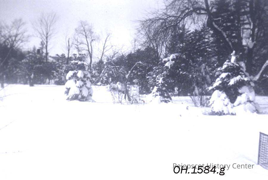 A B/W photograph of the Blizzard of 1952. Snowstorm - February 17 and 18, 1952, showing a field with snow covered trees.